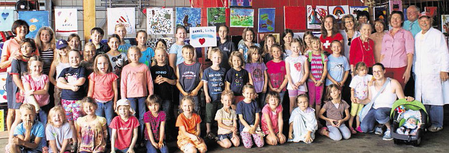 Auf große Resonanz stieß die Malaktion der „Freunde der Kunst“, die von der Künstlerin Katharina Dietlinger (Achte von rechts) geleitet wurde. Die Kinder und auch Bürgermeister Heinz Weigl (Zweiter von rechts) bedankten sich bei Erika Odemer (Fünfte von rechts) für ihre großzügige Unterstützung. Bild: weu