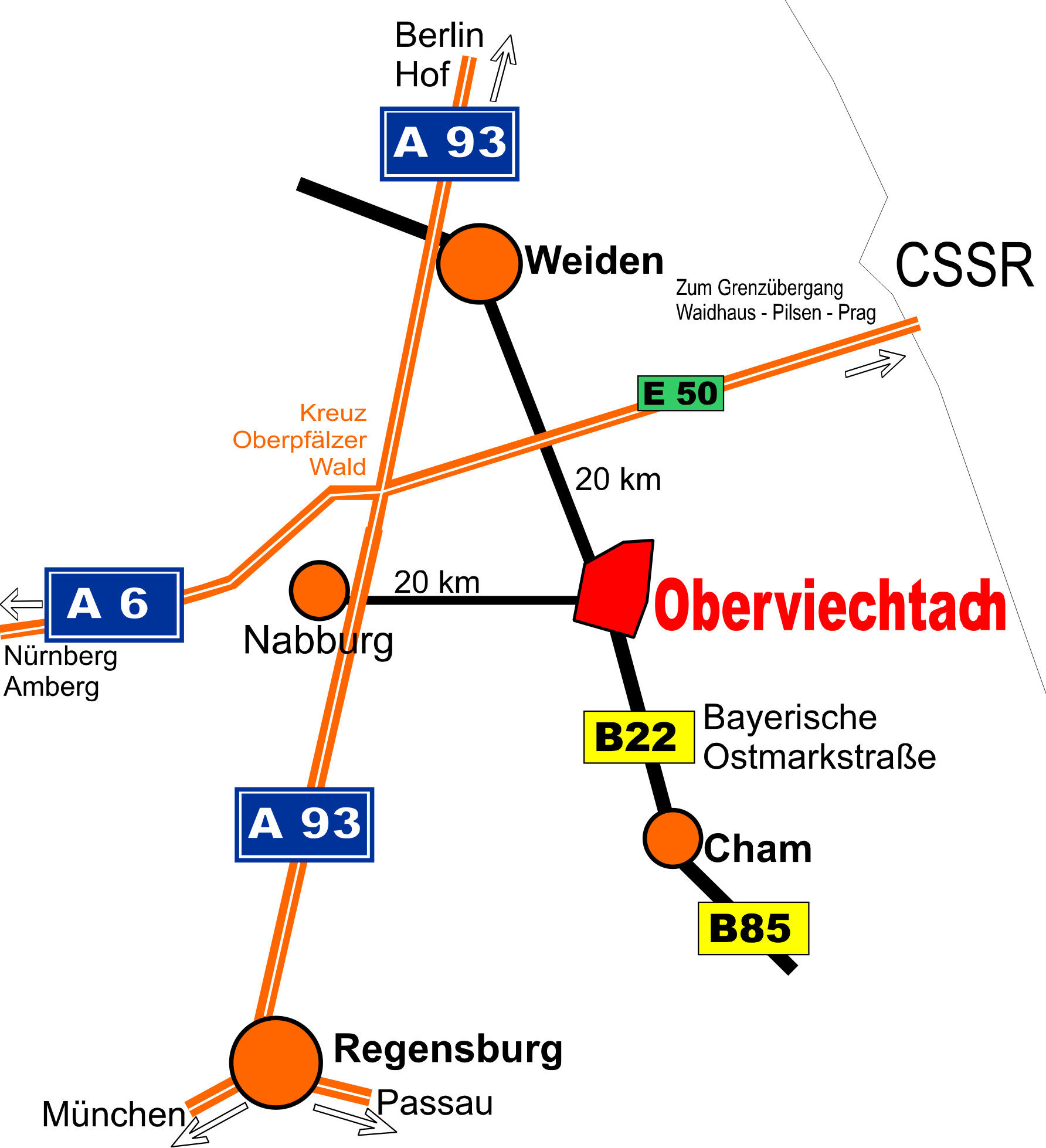 Oberviechtach liegt an der Bundesstraße B 22 (Bayer. Ostmarkstraße). Die nächsten Autobahnanschlüsse zur A 93 und A 6 sind jeweils ca. 20 km entfernt.