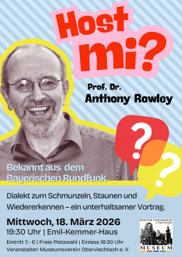 Der Museumsverein Oberviechtach lädt am Mittwoch, 18. März 2026, zu einem besonderen Vortragsabend ins Emil-Kemmer-Haus ein. Unter dem Titel „Host mi?“ spricht Prof. Dr. Anthony Rowley, bekannt aus dem Bayerischen Rundfunk („Wir in Bayern“), über die Vielfalt und den Wert der bayerischen Dialekte – mit besonderem Blick auf die Oberpfalz und den Raum Oberviechtach. Der Vortrag verbindet sprachwissenschaftliche Einblicke mit vielen Beispielen aus dem Alltag und ist bewusst unterhaltsam angelegt. Dialekt wird dabei nicht nur erklärt, sondern lebendig erfahrbar gemacht – zum Schmunzeln, Staunen und Wiedererkennen. Prof. Rowley gilt als einer der profiliertesten Dialektforscher Bayerns und ist einem breiten Publikum durch die beliebte BR-Rubrik „Host mi?“ bekannt. Musikalisch umrahmt wird die Veranstaltung durch die Gruppe Windflieger.